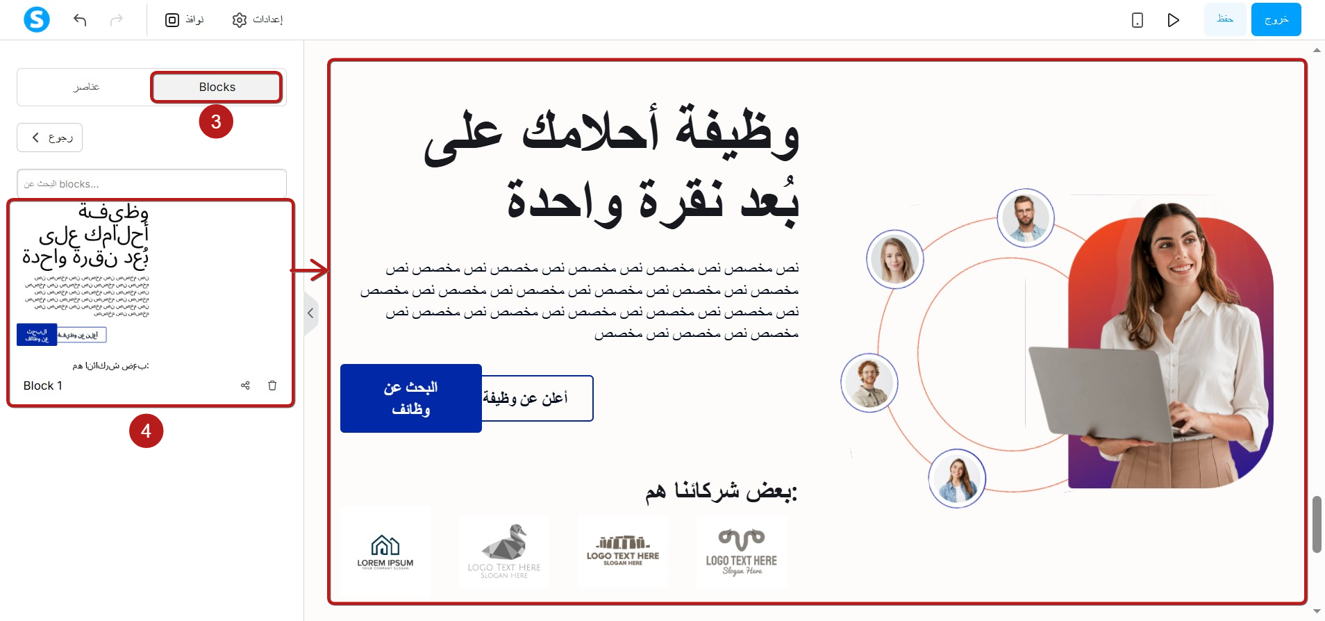 لاستخدام هذا البلوك في صفحة أخرى، افتح محرر تلك الصفحة، انقر على البلوكس (3)، ثم اسحب البلوك المحفوظ وأفلته في الصفحة (4)