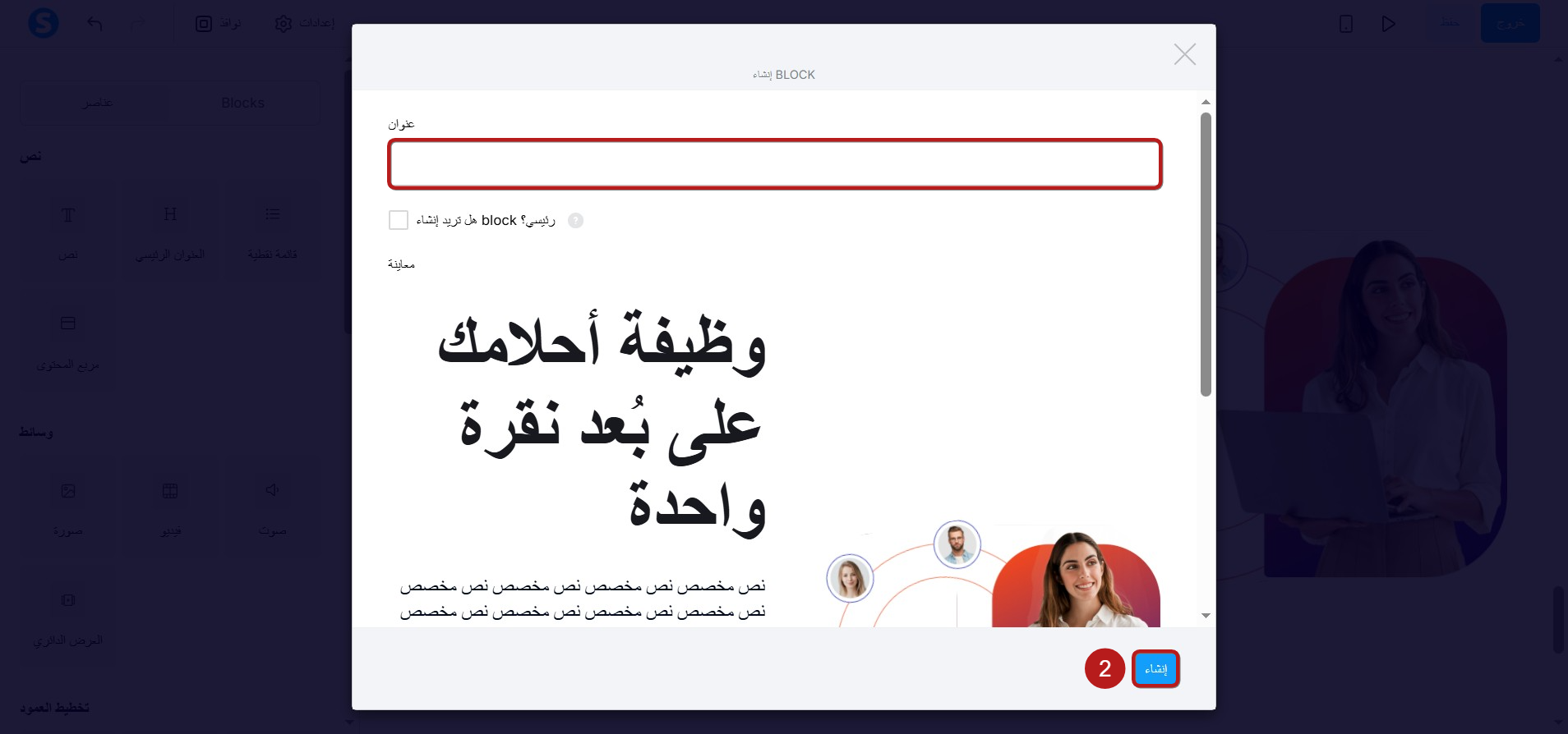 أدخل اسمًا للبلوك لتتمكن من إيجاده بسهولة لاحقًا، ثم انقر على إنشاء (2)